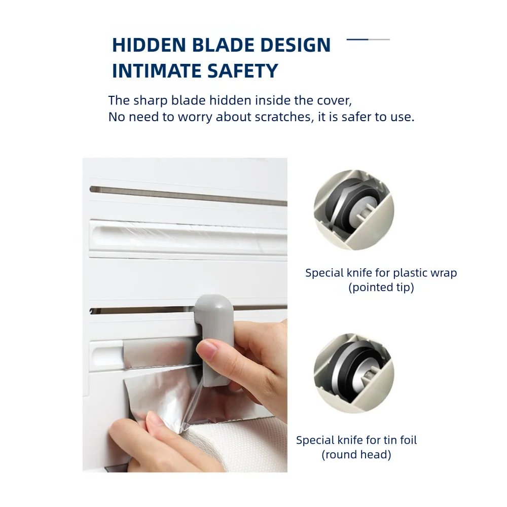 1.Cortador: viene con un cortador en el interior para garantizar la limpieza y dispensación de la envoltura de plástico y el papel de aluminio.