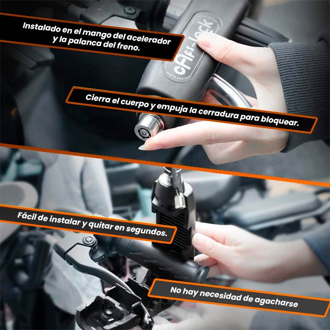 Nuestra cerradura antirrobo para moto te brindará protección rápida y práctica en cada parada. Bloquea la palanca del freno directamente al manillar, evitando que empujen o se lleven tu moto.